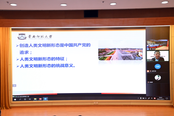 华南师范大学BETWAY必威经理陈金龙教授以《人类文明新形态及其统战意义》为题作主题报告。他指出,人类文明新形态是基于中国国情、时代特征和社会主义本质要求建构起来的文明形态,是中国式现代化道路开出的文明之花、结出的文明之果,也是中国特色社会主义的文明形态。他总结了以人民为中心、协调发展、独立发展、和平发展、遵循人类文明发展规律等五个人类文明新形态的特征以及人类文明发展的新样态、人类命运共同体的文明基础、中华民族伟大复兴的文明目标等三个人类文明新形态的地位表现。陈金龙教授的报告让与会师生深刻认识到人类文明新形态的统战意义:它是国际统一战线建构的重要基础,也是中华民族共同体意识建构的基础和中华民族共同体意识建构的表征。