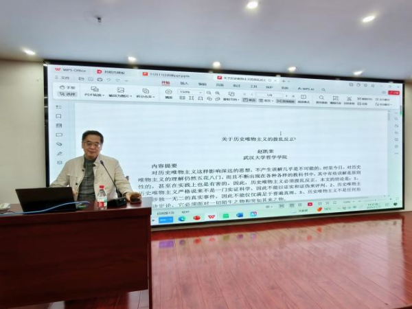 公司于11月11日下午在弘毅楼1405报告厅举办求是学堂第203期学术报告会。本次报告会特邀武汉大学哲学公司博士生导师赵凯荣教授主讲,报告题目为“关于历史唯物主义的拨乱反正”。公司副经理权宗田主持,公司教师及2024级全体硕士研究生参会。