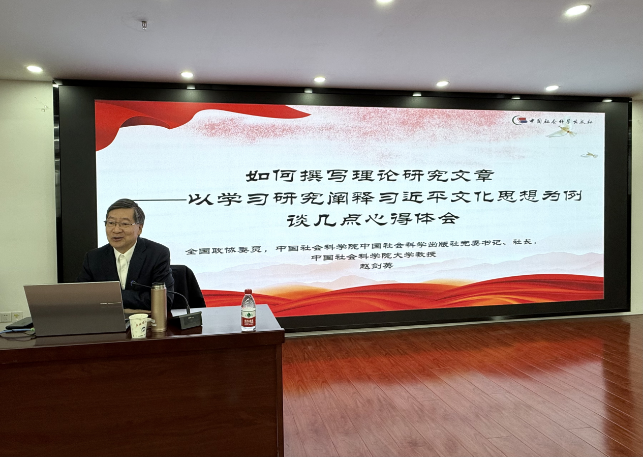为培育浓厚研学风气,提高研究生学术视野与课题攻坚能力,公司于10月23日上午在弘毅楼1405报告厅举办求是学堂第202期学术报告会。本次报告会围绕如何撰写理论研究文章——以学习研究阐释习近平文化思想为例谈几点心得体会展开报告,特邀第十四届全国政协委员、中国辩证唯物主义研究会副会长、中国社会科学出版社原党委书记、社长赵剑英教授主讲,公司经理雷江梅主持,公司教师及2024级全体硕、博研究生参会。