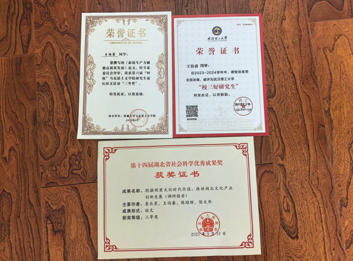 “笃学攻书登榜首,研经探理著华章。”王伯睿始终将学习放在首位,学习态度端正,目标明确。在课程学习上,他刻苦努力,专业基础知识扎实,所有课程平均成绩达到88.6分,名列前茅。在科研方面,他秉持严谨求实的科学态度,在朱喆教授的悉心指导下,积极投身科研工作。主要研究方向为马克思主义政治经济学。在此期间,他阅读了大量中外文献,并取得了阶段性成果:他的研究成果主要集中在对马克思主义基本原理的当代阐释及其现实观照等领域。博士期间,他以独立作者或第一作者身份在《江汉论坛》、《湖北社会主义公司学报》、《中央社会主义公司学报》、《河南师范大学学报(哲学社会科学版)》、《求是学刊》等国内重要学术期刊上发表论文数篇,均与本专业方向紧密相关。其中,发表于《江汉论坛》的《中国式现代化理论体系的思想源流与实践脉络》一文,被《中国社会科学文摘》作为论点摘编。此外,他还积极参与了导师主持的省部级项目“习近平新时代中国特色社会主义思想的文化基因研究”,承担了课题申报以及部分核心章节的文献梳理与初稿撰写工作。同时,他参与撰写的“挖掘荆楚文化时代价值,推动湖北文化产业创新发展(调研报告)”获得了第十四届湖北省社会科学优秀成果奖三等奖。这些成果不仅体现了他独立从事创新性研究的潜力,也展现了他将理论思考转化为学术文本的能力。通过系统地科研训练,他的文献检索、实验操作、数据分析和论文撰写能力得到了显著提升。