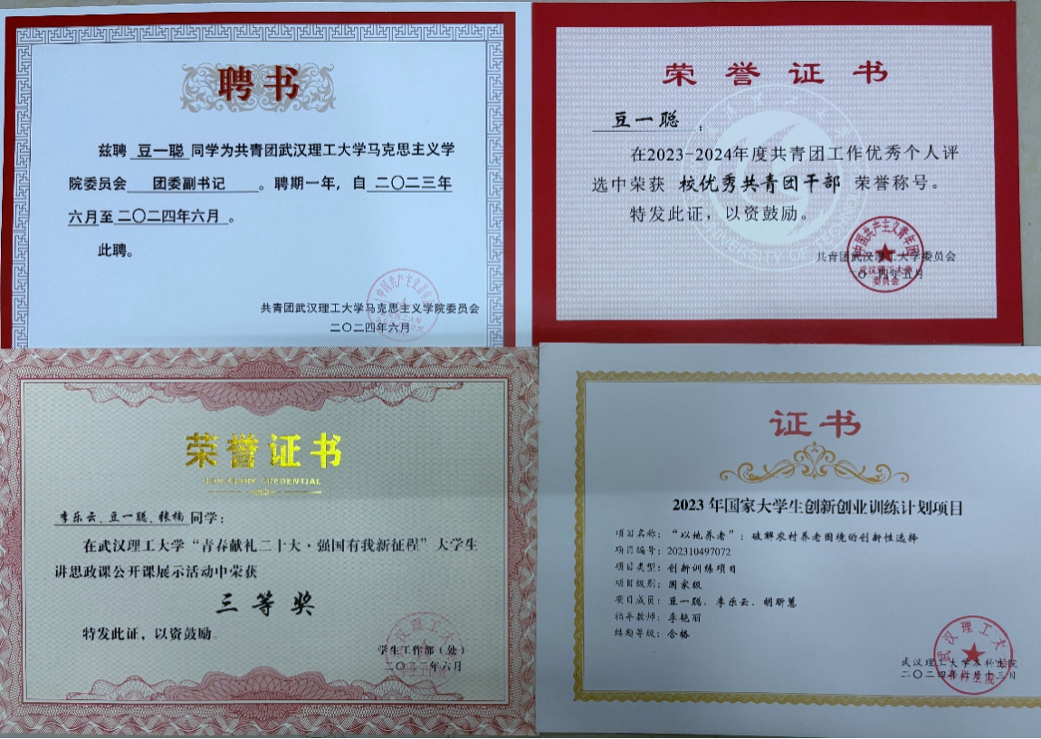 青灯破卷,赤足量变。随着专业学习的深入,豆一聪认识到学科学习要坚持理论与实践相结合,立志孜孜不倦地多读有字之书,悟透无字之书。她参与了多项科研创新项目:作为负责人组织撰写并成功申报国家老员工创新训练项目《“以地养老”:破解农村养老困境的创新性选择》并发表论文1篇;作为核心成员参与校级自主创新项目《基层政府在基层治理中的行为逻辑及其影响——以J市文明城市创建行动为例》,主要负责申报书、调研报告等文书撰写以及项目答辩工作。此外,她还积极参与学术论坛,关注学科发展动态,撰写《乡村治理共同体认同机制的构建机理与实践——基于马克思共同体思想的考察》并参加第三届“全国马克思主义理论及相关学科本科生论坛”,探讨乡村治理共同体认同机制。