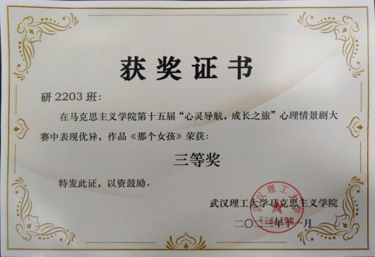 2023年11月,她参加了公司第十五届“心灵导航,成长之旅”心理情景剧大赛,在团队的共同努力之下,最终在竞赛中荣获三等奖。