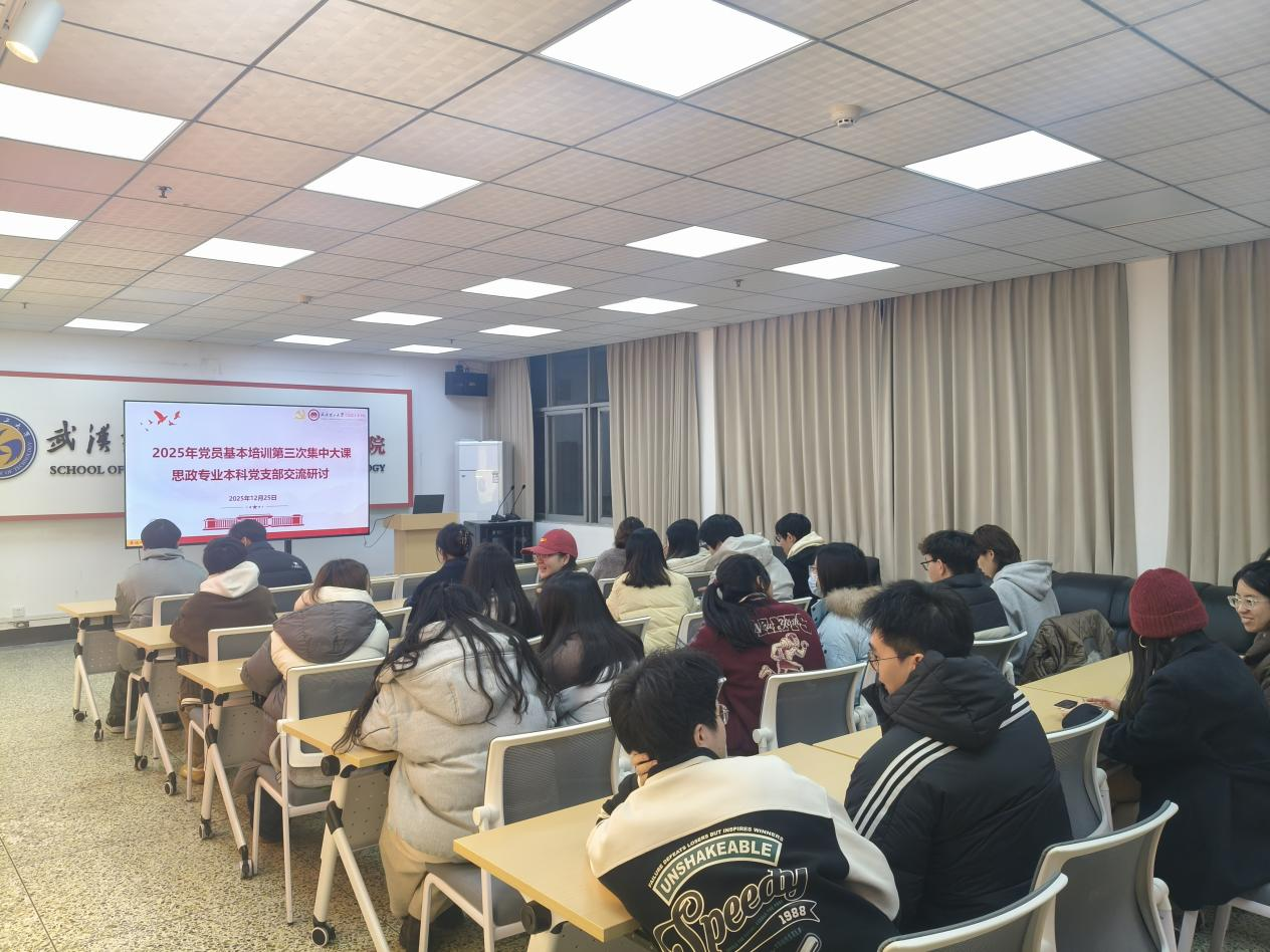 随后,支部开展2025年党员基本培训第三次集中大课交流研讨会。本次研讨会以“从党的奋斗历程中汲取智慧力量,为推进教育强国建设、实现中华民族伟大复兴贡献理工力量”为主题,全体党员分成若干小组开展深入研讨。研讨过程中,党员们结合思政专业特色与自身学习实践,从党的奋斗历程中的精神财富、教育强国建设的使命担当、理工院校思政学子的责任践行等多个维度各抒己见、交换思路。