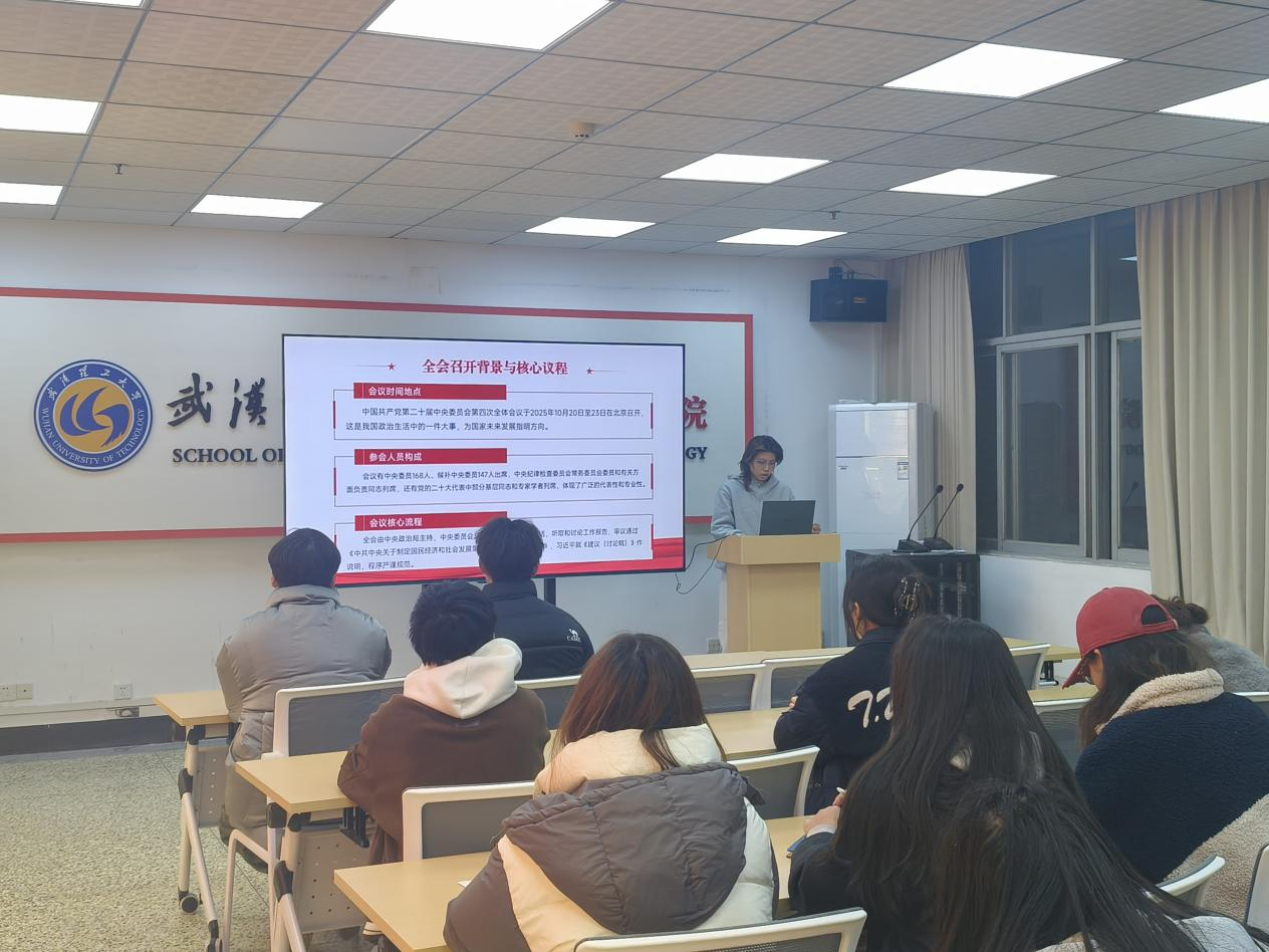 最后,陈玟珊同志为全体党员作学习党的二十届四中全会精神专题分享。她从全会召开的时代背景与核心议程切入,讲解了全会的全局意义与战略价值,通过梳理“十四五”时期我国在经济发展、民生改善等领域取得的辉煌成就,以及“十五五”时期教育发展的指导思想与目标框架,重点聚焦全会对教育发展作出的顶层设计和战略擘画,让党员们深刻感受国家发展的强劲脉动。分享尾声,陈玟珊同志呼吁支部全体党员,要立足专业优势,主动对标全会要求,充分发挥党员先锋模范作用,在思政理论传播、立德树人实践中贡献青春力量。