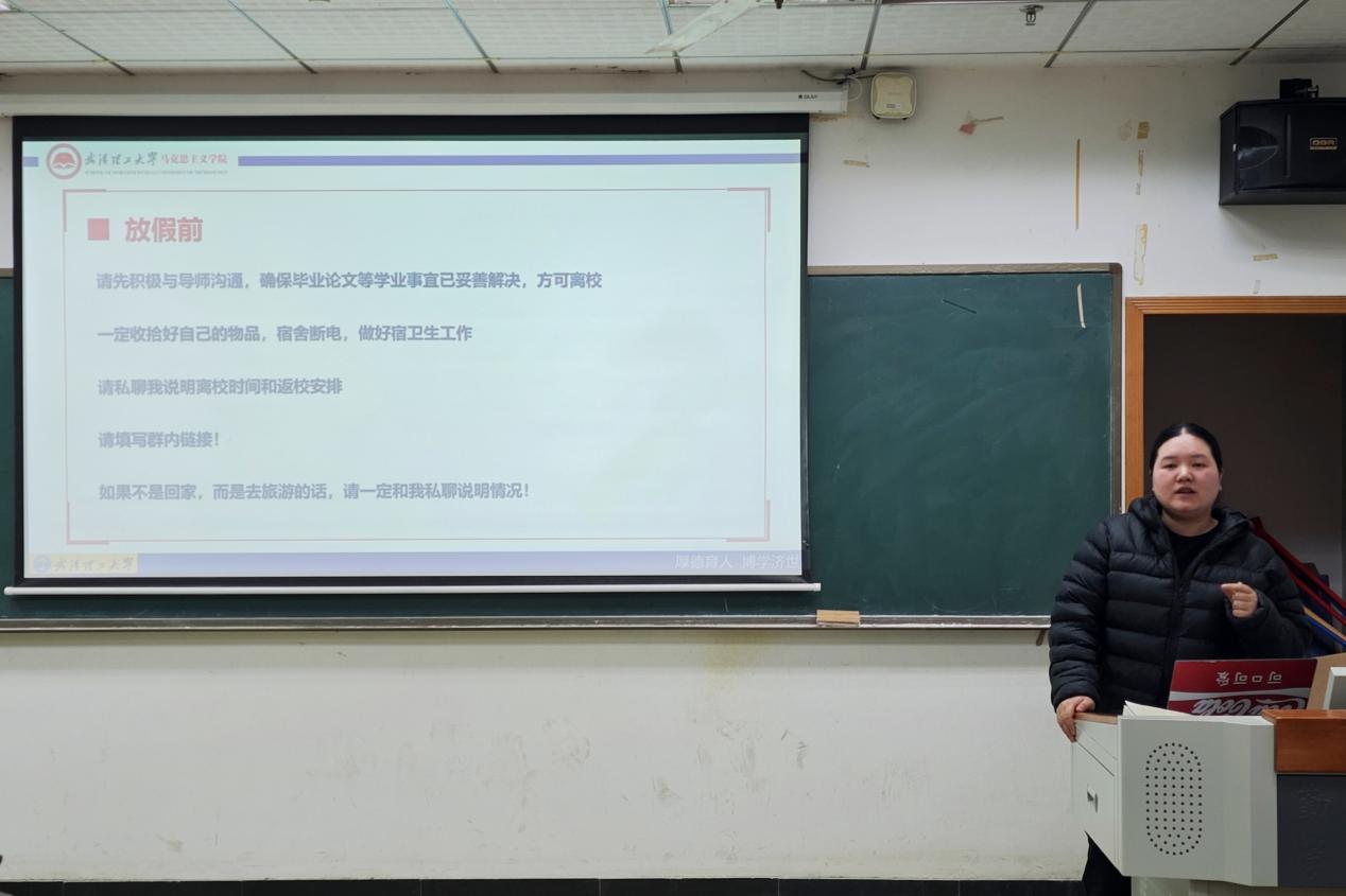 随后,陶倩倩老师着重强调了毕业论文开题工作的重要性。她明确指出,假期是进行文献梳理、思路凝练和开题报告撰写的关键时期,鼓励同学们充分利用假期时间,主动与导师保持沟通,扎实推进学术研究,为下学期的学业进程打下坚实基础。她建议同学们制定切实可行的假期学术计划,确保学习不断线、科研有进展。