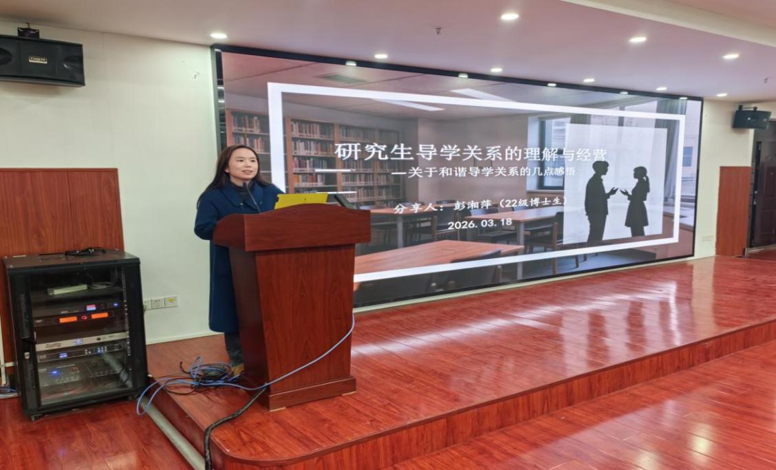 活动伊始,彭湘萍学姐以“研究生导学关系的理解与经营”为主题,结合自身科研与求学经历,向同学们系统地分享对研究生导学关系的理解与实践经验。她指出,和谐导学关系是研究生成长成才的重要基石,应秉持“尊重、沟通、协同、共进”原则,从明确学术定位、主动规划交流、理性处理分歧、强化责任担当四个维度,搭建良性互动的导学共同体。