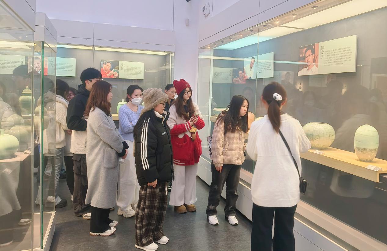 跟随讲解员的步伐,师生党员们步入展厅,开启了一场融合视觉享受与思想启迪的探索之旅。艺术馆内展品琳琅满目,不仅有气势恢宏的国画、笔走龙蛇的书法,还有精美绝伦的瓷器作品。从青花瓷的素雅清丽,到釉里红的浓艳深沉;从造型古朴的传统器皿,到充满现代设计感的创新之作,这些泥土与火焰淬炼出的艺术瑰宝,静静地展示着中华优秀传统文化的深厚底蕴与历久弥新。一幅幅生动的画作,一件件精美的艺术品,仿佛无声的语言,诉说着艺术家们对时代的感悟、对生活的热爱、对美的追求。