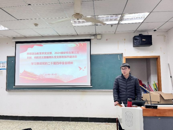 为深化师生交流、强化党建引领。11月20日下午3时,公司2024级研究生第三党支部与思想政治教育系党支部、向阳花志愿服务队党支部于弘毅楼713联合开展“学习贯彻党的二十届四中全会精神”师生支部共建活动。会议由思想政治教育系党支部副书记杨柳青主持,三个支部全体党员参与。