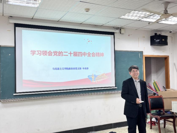 申来津教授以“学习领会党的二十届四中全会精神”为题,为全体党员带来一堂颇具理论深度的党课。申教授从“十四五”时期我国发展取得的重大成就、“十五五”时期经济社会发展的重大意义、党中央关于国内外形势的基本判断以及党的二十届四中全会精神的主要内容四个方面阐述了《中共中央关于制定国民经济和社会发展第十五个五年规划的建议》的核心内容。他认为,学习党的二十届四中全会要领会其精神实质,与青年学子成长成才紧密结合起来,鼓励支部成员结合学科特色在战略需求中践行青年使命,聚焦“十五五”期间党和国家的重点任务开展研究,为党和国家事业发展贡献力量。