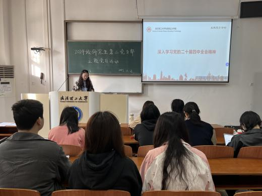 为深入学习贯彻党的二十届四中全会精神,进一步增强党员政治自觉和思想自觉,11月13日上午八时三十分,2024级研究生第二党支部于致远楼111室开展“深学全会精神,筑牢信念勇当先锋”主题党日活动。本次活动由党支部书记曲晶晶同志主持,支部全体党员积极参与。