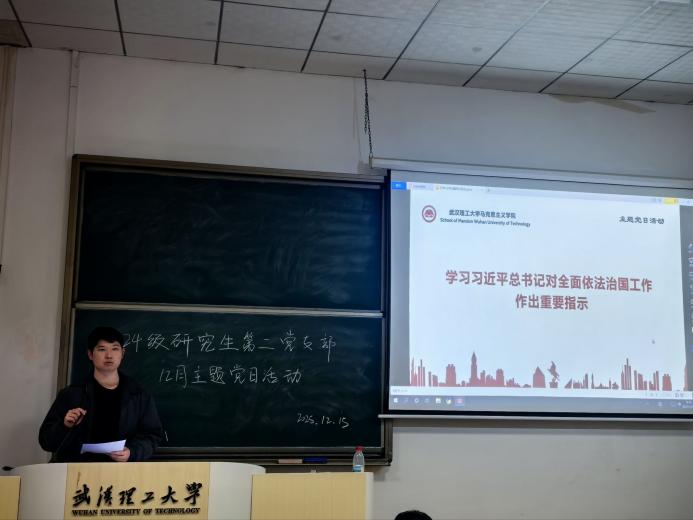 为深入学习贯彻习近平法治思想,切实强化党员法治意识,筑牢习近平法治思想根基,12月15日晚7:00,2024级研究生第二党支部在致远楼111室组织开展“弘扬宪法精神,增强法治意识”主题党日活动。本次活动由党支部书记曲晶晶同志主持,支部全体党员积极参与。