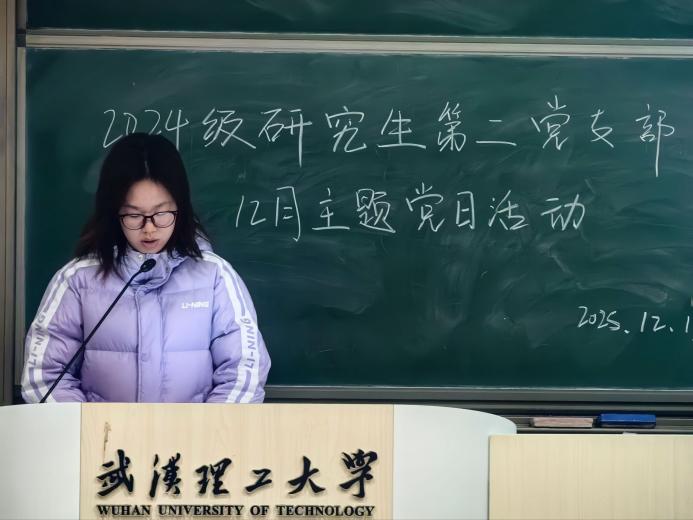 会议第三项,由徐雅欣同学引领大家学习《为推进中国式现代化贡献更多教育力量——访教育部党组书记、部长怀进鹏》。她紧紧围绕党的二十届四中全会精神,精准解读了“十五五”时期经济社会发展的指导方针与主要目标,着重梳理了规划中关于教育、科技、人才发展的部署要求。她指出,在推进中国式现代化的进程中,科技是关键要素,人才是坚实基础,教育是根本所在。作为研究生党员,应当深刻认识到自身肩负的使命,在学习和科研工作中积极践行相关要求。