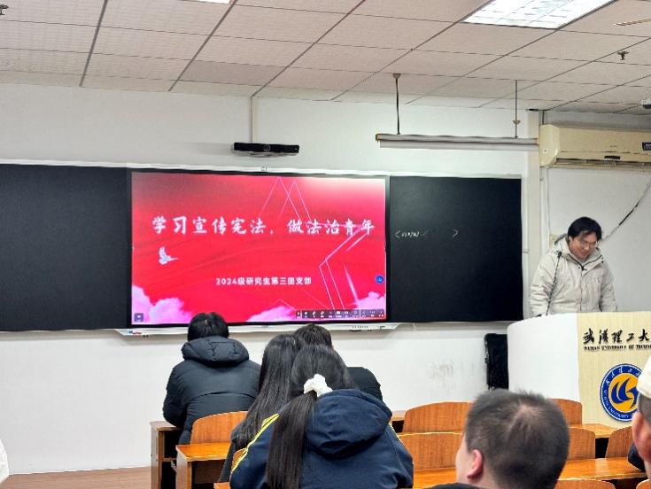 会议第一项,团支部成员陈泽伟领学《学习宣传宪法,做法治青年》。他围绕宪法的核心要义与时代价值进行阐释,结合研究生科研实践、校园生活等场景,剖析法治精神在学术诚信、权益维护中的具体体现,号召支部成员树立宪法意识,将法治理念内化于心、外化于行,以青春之力践行法治使命,争做尊法学法守法用法的新时代青年。